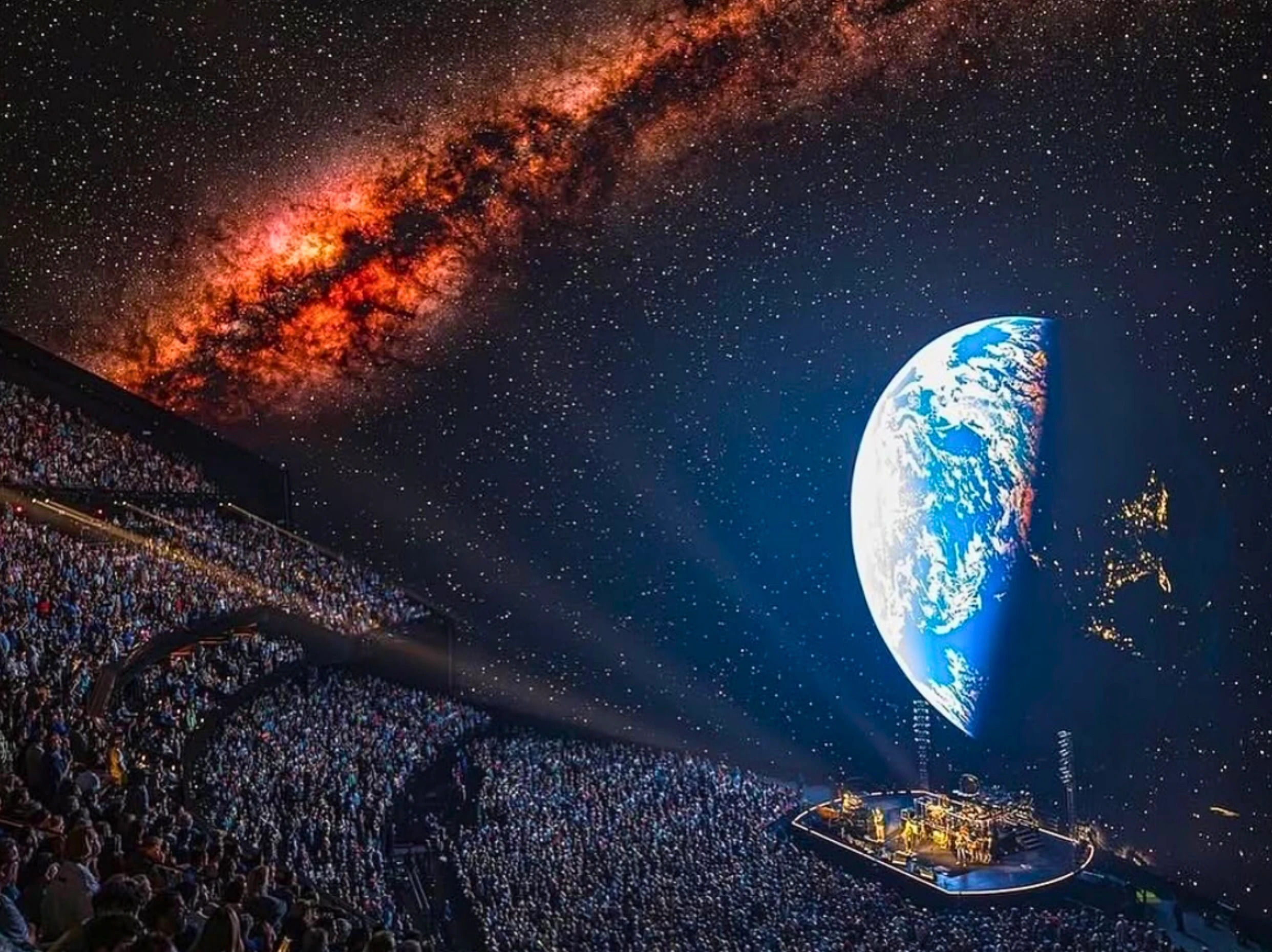 Mas o verdadeiro espetáculo acontece dentro. A arena comporta 18.600 pessoas e possui a maior tela LED de alta resolução do mundo, envolvendo completamente a audiência em 16K de resolução. O sistema de som Holoplot, com 164.000 alto-falantes, cria uma experiência acústica tão precisa que cada assento tem seu próprio campo sonoro perfeito.
